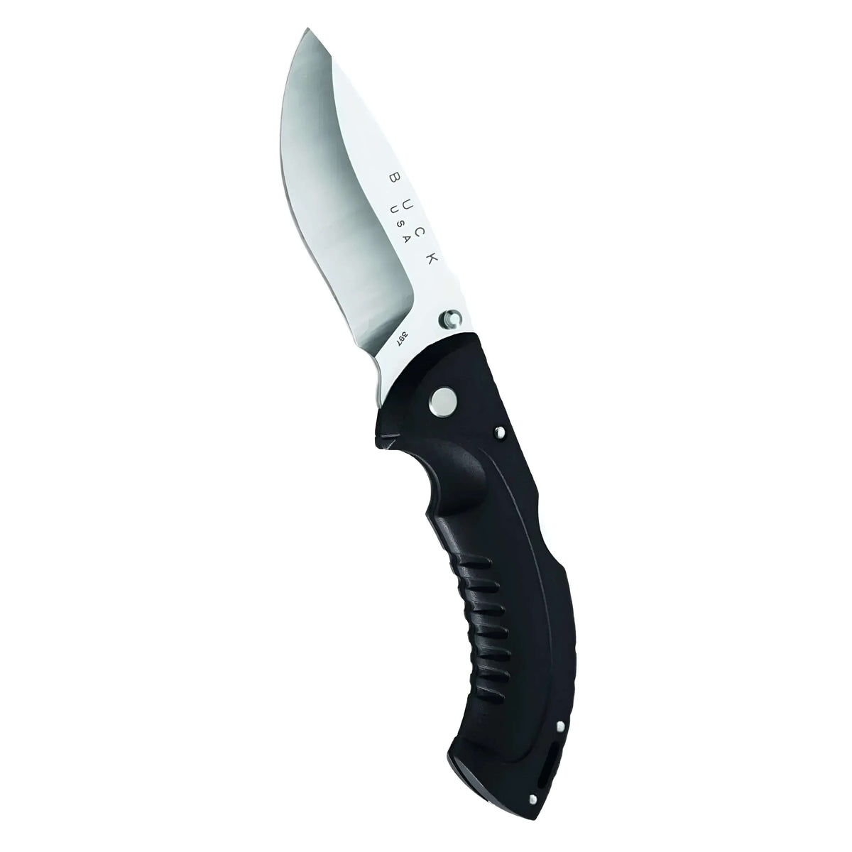 The illustrated Buck Knife is the 10PT Buck Folding Omni Hunter Knife that features a 3in. locking drop point blade made of 420HC stainless steel. The blade of this Buck knife has dual thumb studs for ambidextrous one hand opening, and a notched thumb rest for secure grip. The contoured black glass reinforced polypropylene handle, 4-5/8in. closed, has a black Dynaflex rubber overmold, finger groove and grip ridges, a lockback and a lanyard hole. A heavy duty black nylon sheath is included with this Buck knife. The 10PT Buck Folding Omni Hunter Knife with Drop Point blade and Black handle weighs 2.8 ounces.