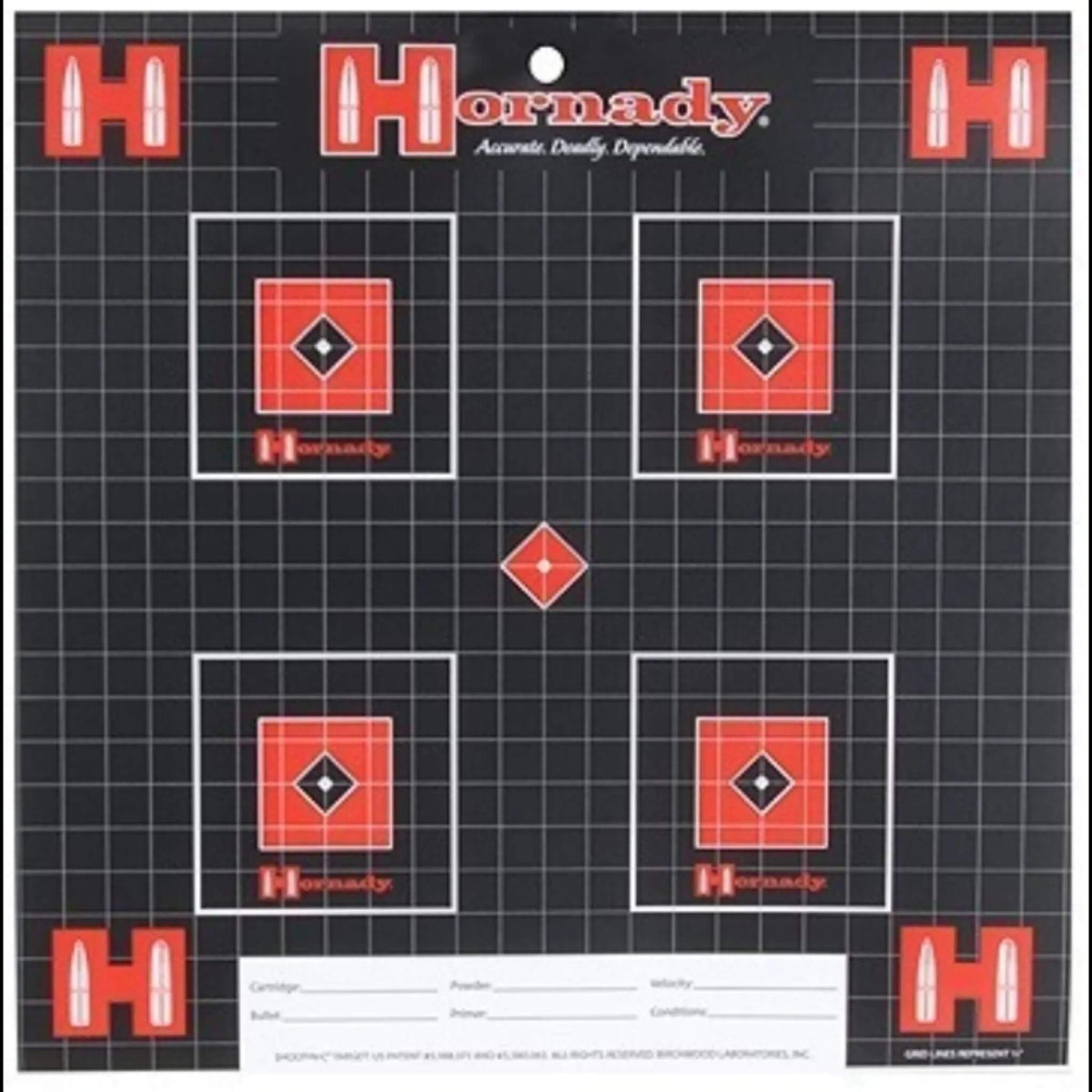 Hornady Lock-N-Load Targets feature a half-inch grid pattern and multiple aiming points. Vivid white bullet hole blasts provide long-range visibility without binoculars or spotting scopes. Immediate feedback makes target practice fun and productive.