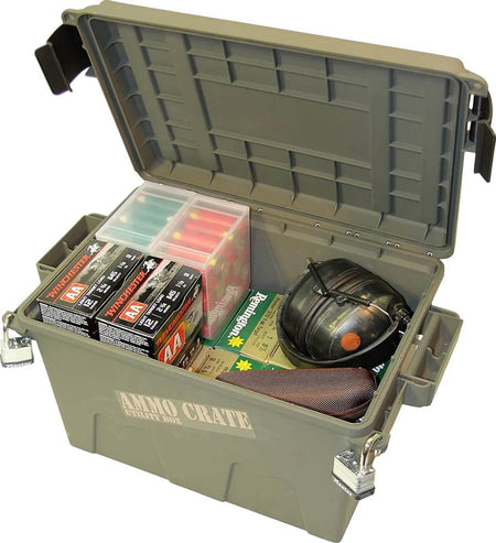 Designed for ammo storage, although perfect for storing shooting, hunting or survival gear. Two extra strong handles make it easy to carry 65 pounds gear. Designed to be stacked high, using molded-in stacking ridges. Four tie down points for ATV attachment. Utilizing MTM's tongue and groove O-Ring seal system for a superior water-resistant dry storage. Double padlock tabs along with two strong latches make these ammo crates the perfect solution to so many storage needs. Made in the USA, with high-impact polypropylene plastic. Can be used as a boaters dry storage box, first aid, safety and RV camper storage container. Carry up to 65 pounds of gear with two strong side handles Stackable design and double padlock tabbed for security; Four tie-down points on side Water-resistant O-ring seal for dry storage; Non-submersible 890 Cubic Inches Exterior Dimensions: 17.2" x 10.7" x 9.2(H); Interior Dimensions: 12.4" x 8.4" x 8.5"(H) The latches are mounted on side for easy carrying; Made in USA