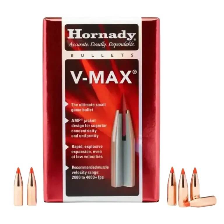 With its combination of proven materials, innovative design and streamlined profile, the Hornady® V‑MAX® represents the pinnacle of what a specialized varmint bullet can achieve, offering straight‑line trajectories, enhanced accuracy, dramatic expansion and explosive fragmentation at a wide range of distances and velocities.