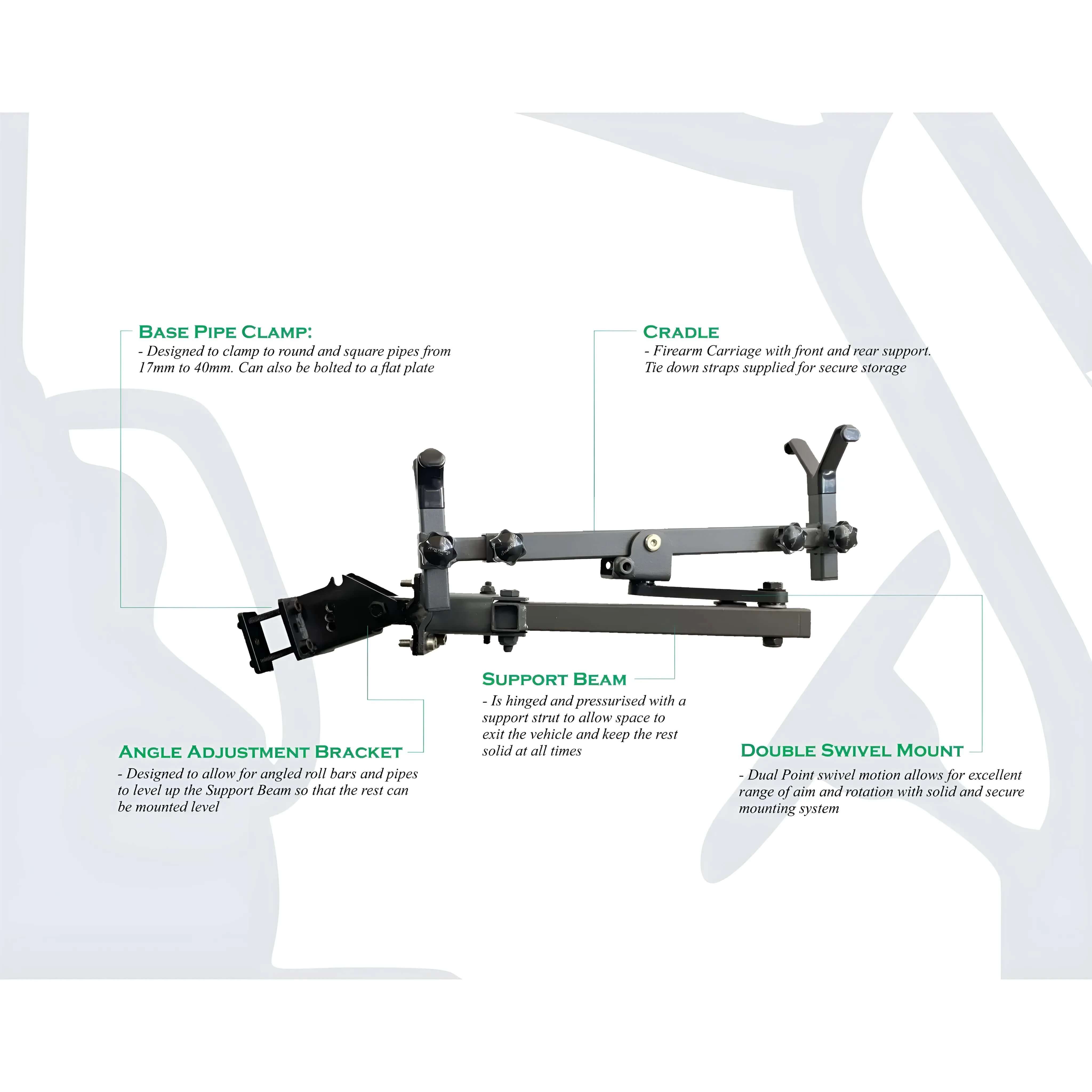 The Side Mount Gun Rest is a steel framed Gun Rest and Cradle system that stores a firearm in a safe position while travelling and acts as a stable rifle support for excellent accuracy while taking a shot. It is designed to be mounted in the door way opening of a side x side or UTV vehicle. Usual mounting points are (but not limited to) handle bars or roll bar pipes in the door way opening of the vehicle door entrance. The advantages of a mounted firearm in this location are: