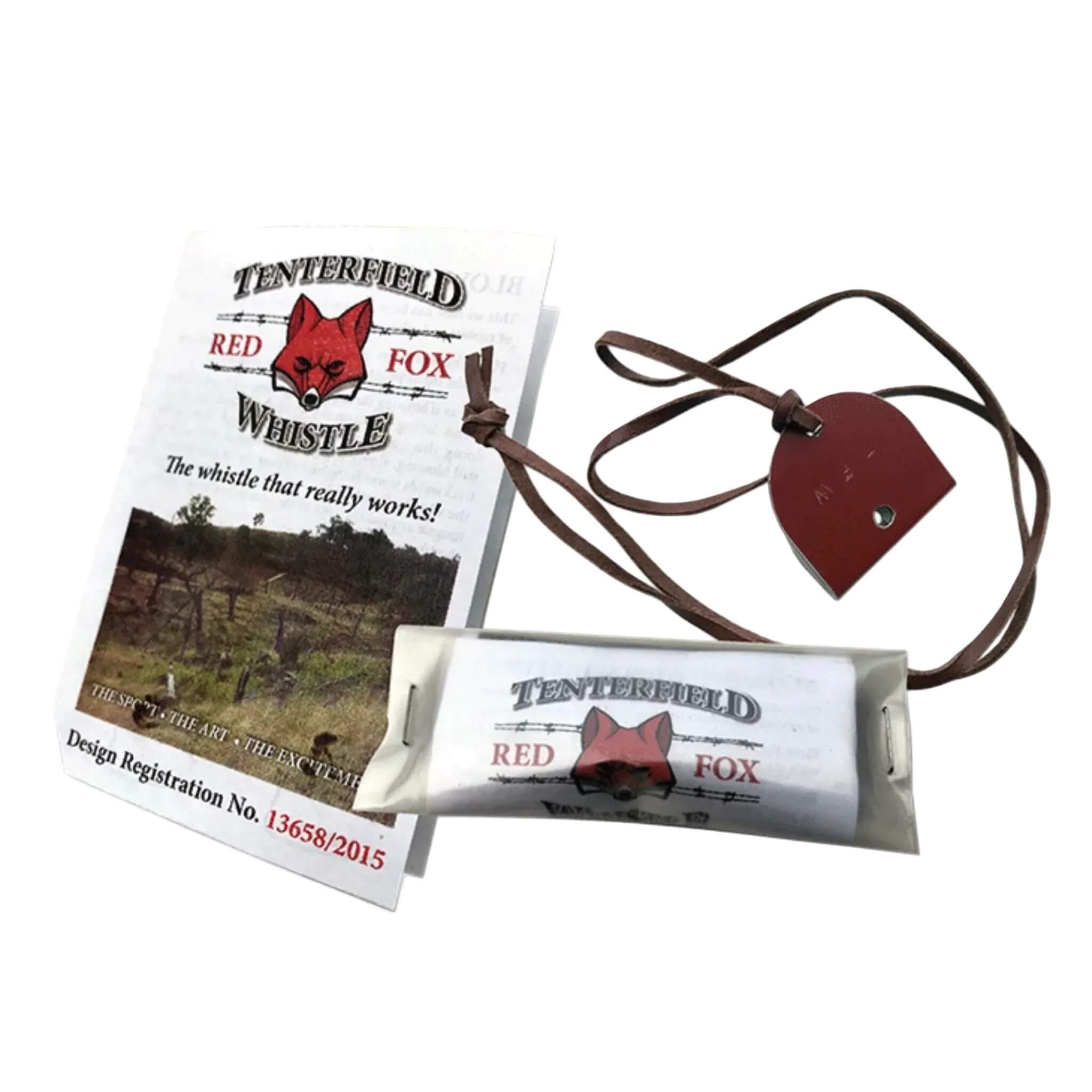 The Tenterfield Red Fox Whistle comes wrapped in a brochure which has been updated, contains instructions on how to blow it, a guide for "Apprentice" whistlers, an important section on firearm safety, and has an attractive leather thong lanyard.